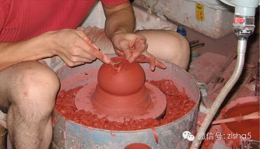 最后介绍一下手拉胚壶,所谓手拉胚,并不属于紫砂成型工艺,其实是用机械操作的,下面设置一个马达,上面放置一个圆盘,把泥料放在圆盘上,开启开关,马达旋转运作,利用惯性离心力,用手拉出一个壶型来,拉出来后切下,放置晾干,再配壶嘴、壶把(均为灌浆制作的),装成一把茶壶,放置晾干后再喷浆,经过烧制就可以手拉胚壶。注意:纯正的紫砂是不能用作手拉胚的,因为在离心过程中,纯紫砂承受不了离心力,往往会拉破,所以手拉胚中一定要加入一定量的高岭土,这是一种做瓷器的用料,添加高岭土的紫砂壶烧成后瓷化比较严重,不但透气性差,泡养之后也不易产生变化,大部分手拉胚壶会加入玻璃水,新壶看上去已经非常光亮,价格也相对较低。